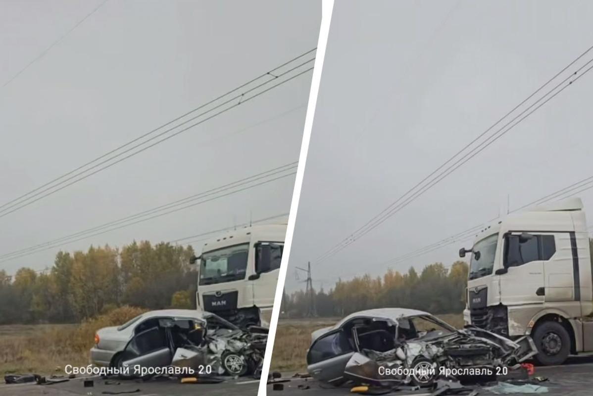 Четверо в больнице: в Ярославской области жестко столкнулись иномарка и грузовик. ВидеоМашину смяло как консервную банку