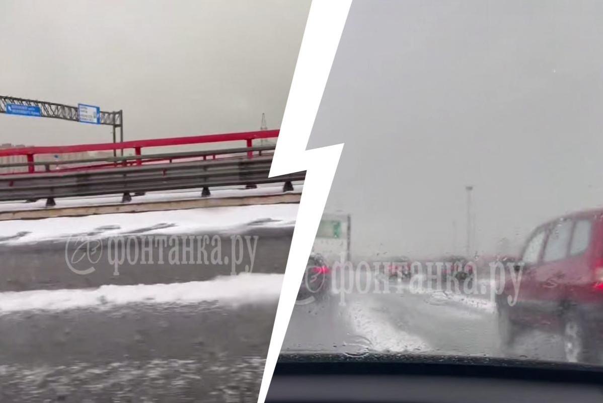 По дорогам Санкт-Петербурга разлились снежные реки и выпал град, машины тонут. КадрыВ городе объявлен «желтый» уровень опасности
